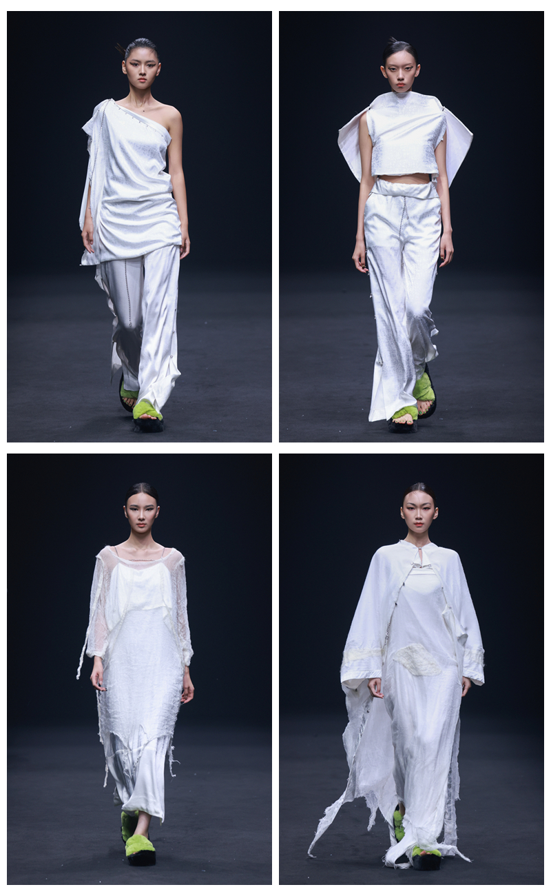 On the catwalk, Ms. Chen presented the womenswear series “HEZHUO・Impermanence”. Developed through the joint R&D platform of “HEZHUO”, the collection combines intangible-heritage craftsmanship with market-oriented innovation, solving technical bottlenecks in inheriting and commercializing traditional techniques while providing staff and students with a real-world practice arena—creating a win-win resonance between teaching outcomes and industrial needs.